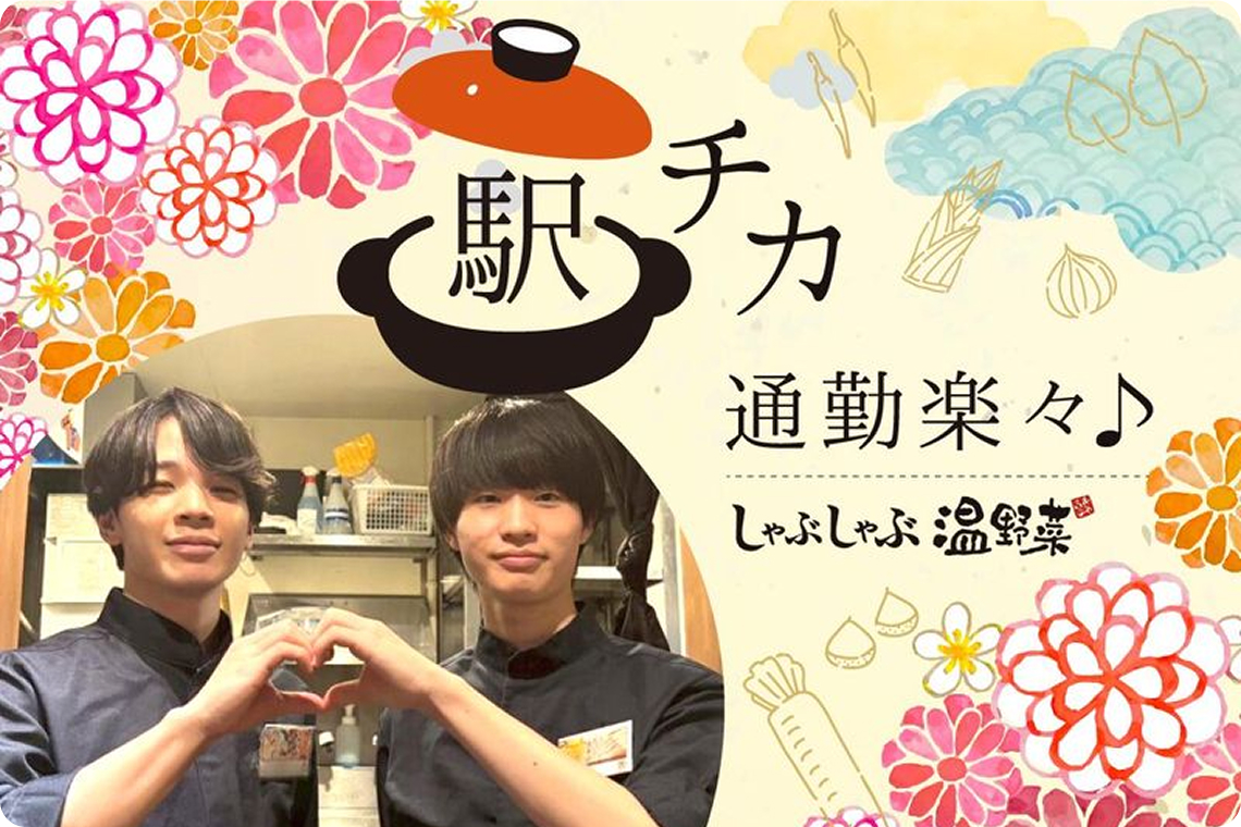 | 仕事内容 | 温野菜のホール・キッチンスタッフとして、オーダー取りや料理提供などの接客業務全般と、料理の盛り付けや⾷器洗いなどの調理補助をお願いします。 出来ることから⼀つずつお任せしていくので未経験でも⼤丈夫︕慣れれば臨機応変に動けるようになりやりがいも抜群︕元気な笑顔でお客さまをお迎えしましょう︕ |